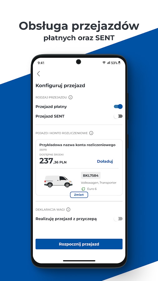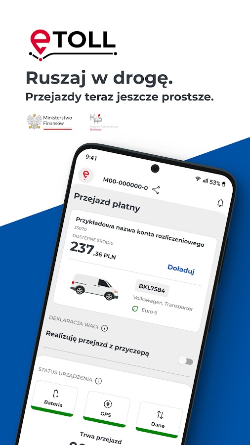 Благодаря приложению e-TOLL PL использование платных участков национальных дорог станет проще, чем когда-либо. Начни свое путешествие в приложении и плати автоматически со своего смартфона или планшета. Если вы также имеете дело с перевозкой товаров, подпадающих под действие Электронной системы надзора за перевозками (SENT), воспользуйтесь дополнительной функцией наблюдения за поездкой в приложении.
