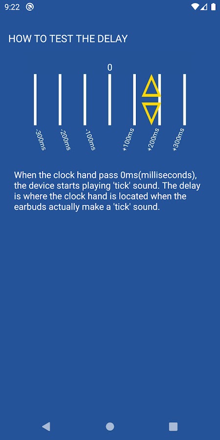 Когда стрелка часов проходит 0 мс (миллисекунд), устройство начинает воспроизводить тиковый звук. Задержка — это то, где стрелка часов расположена, когда наушники действительно издают «тиковый» звук.