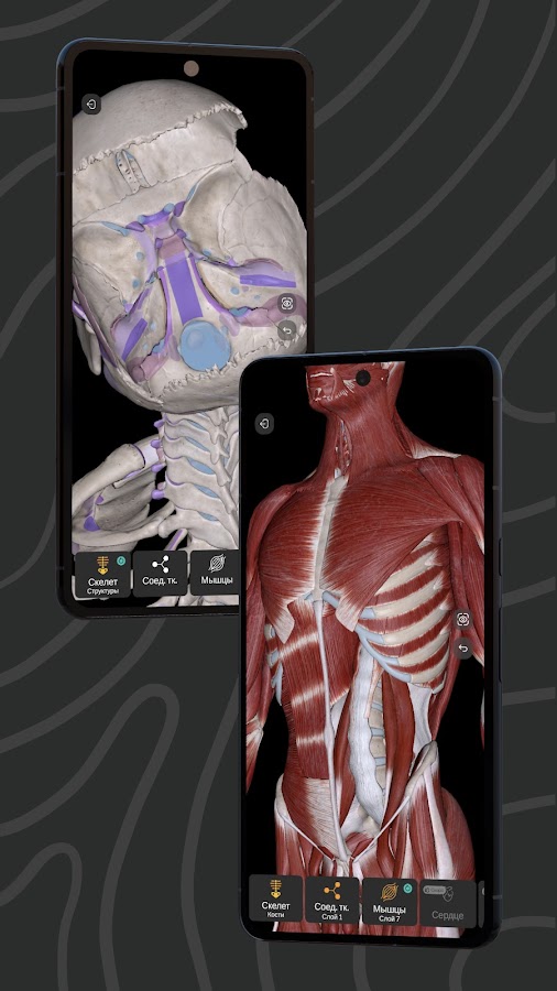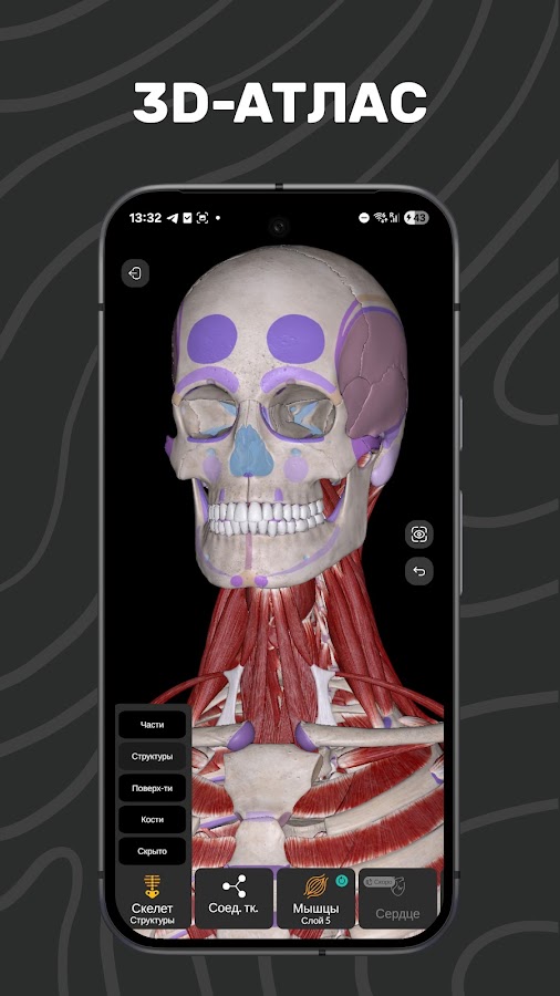 Анатомически точный 3D-Атлас. Изучай системы организма с максимальной детализацией. Удобный интерфейс и плавная навигация помогают сосредоточиться на главном — знании.