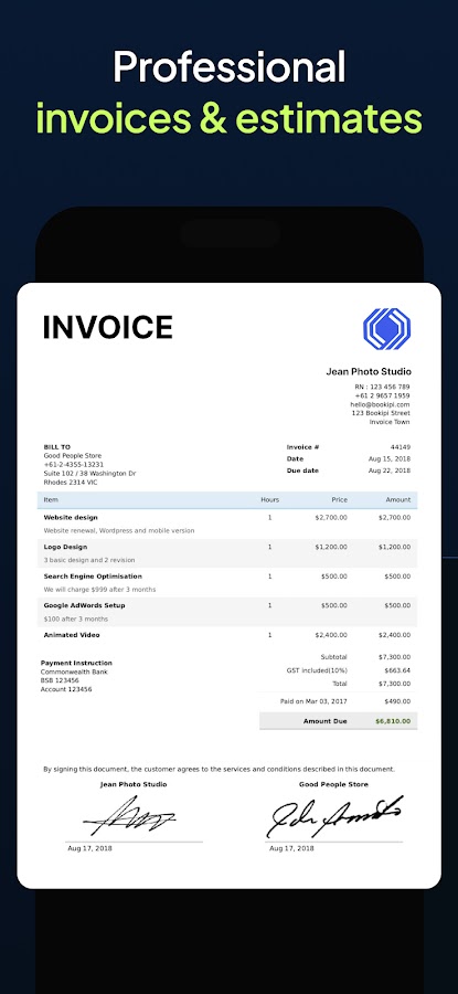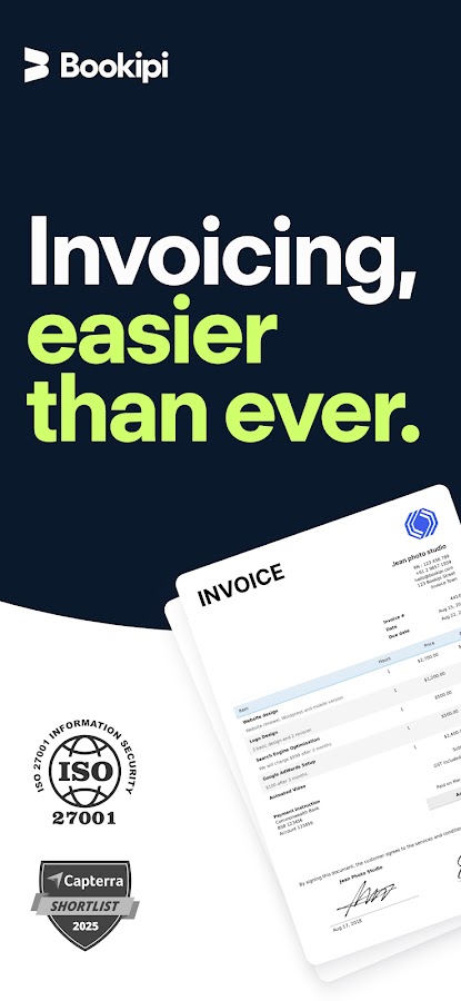 Попробуйте Bookipi сегодня и оцените самый простой способ отправлять счета, создавать сметы, собирать платежи и развивать свой бизнес — все это с вашего устройства Android.
