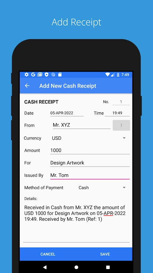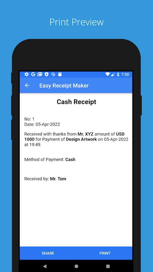 Easy Receipt Maker предназначен для цифрового подтверждения получения наличных денег от человека или компании. Это важное приложение для ваших личных и деловых операций.