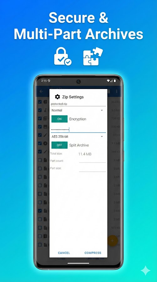 Главные функции: 🔹 Мгновенная распаковка (Unrar & Unzip) файлов. 🔹 Поддержка шифрования AES для максимальной приватности. 🔹 Работа с многотомными (разделенными) архивами без ошибок. 🔹 Сжатие фото и документов для экономии места. 🔹 Встроенный файловый менеджер для удобного управления папками. 🔹 Маленький размер APK: Быстро скачивается и экономит ваш мобильный трафик.