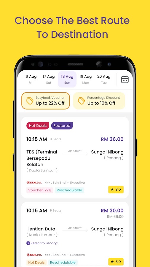 Выбирайте из более чем 700 автобусных операторов и более 20 000 автобусных маршрутов по всем популярным туристическим направлениям Юго-Восточной Азии. Среди автобусных маршрутов — Куала-Лумпур, Терминал Берсепаду Селатан (TBS), Пенанг, Джохор-Бару (Ларкин), Ипох, Малакка, Кэмерон-Хайлендс, Сингапур, Серембан, KLIA, KLIA2, Гентинг-Хайлендс, Мерсинг, Келантан, Кедах, Тренгану и многие другие. Путешествовать между городами стало ещё проще: вы можете мгновенно забронировать билеты на автобус по всем этим направлениям с помощью приложения Easybook для онлайн-бронирования билетов. Билеты дешевле, чем в кассе, и множество акций онлайн на Easybook!