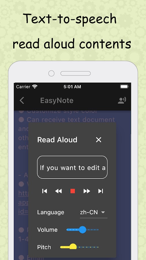 Support Text-to-speech(TTS). Read aloud Note when your eyes tired, hurt or are busy elsewhere. Strongly recommended Google speech engine(Google Text-to-speech), it has best compatibility with EasyNote.