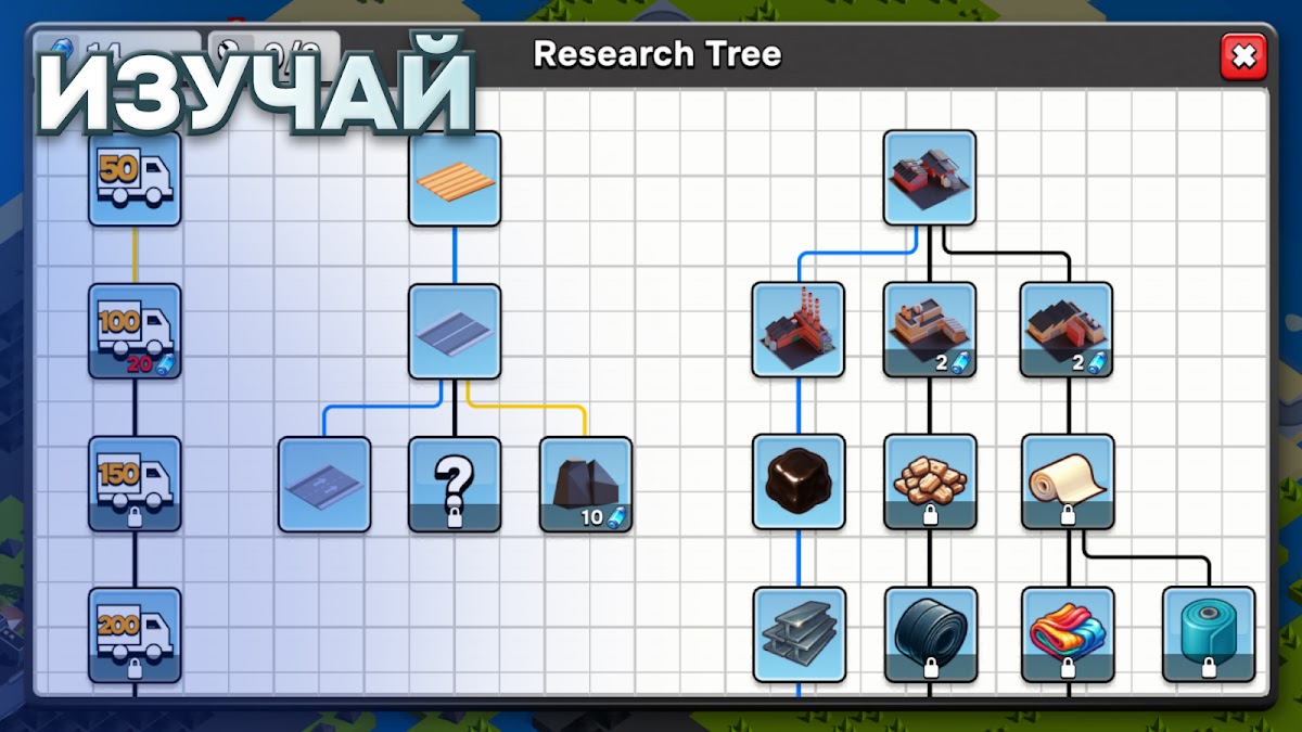 Соединяйте все элементы своей инфраструктуры дорогами трёх видов: грунтовые, городские и магистральные. Планируйте маршруты и развивайте сеть доставки, чтобы обеспечить бесперебойную работу ваших предприятий.