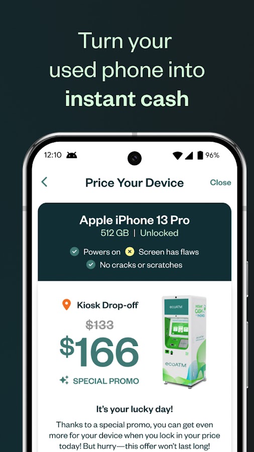 Совершенно новое приложение ecoATM предлагает множество функций, которые упрощают продажу или переработку ваших смартфонов. Это безопасный, надежный и удобный способ оказать положительное влияние на планету, а также положить деньги в свой карман.