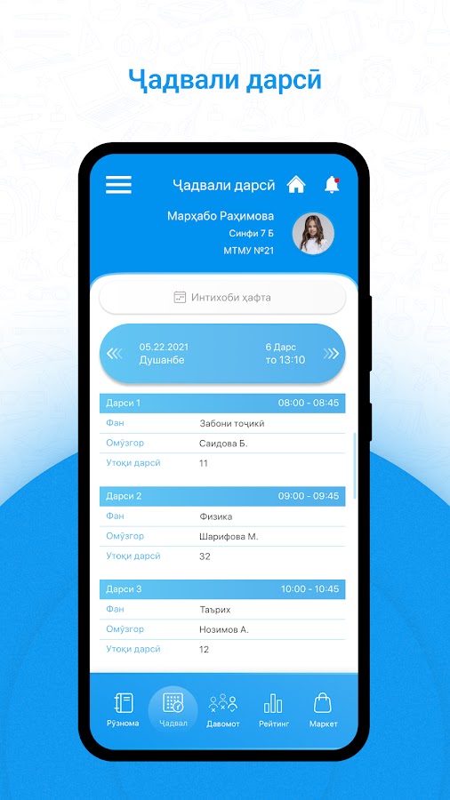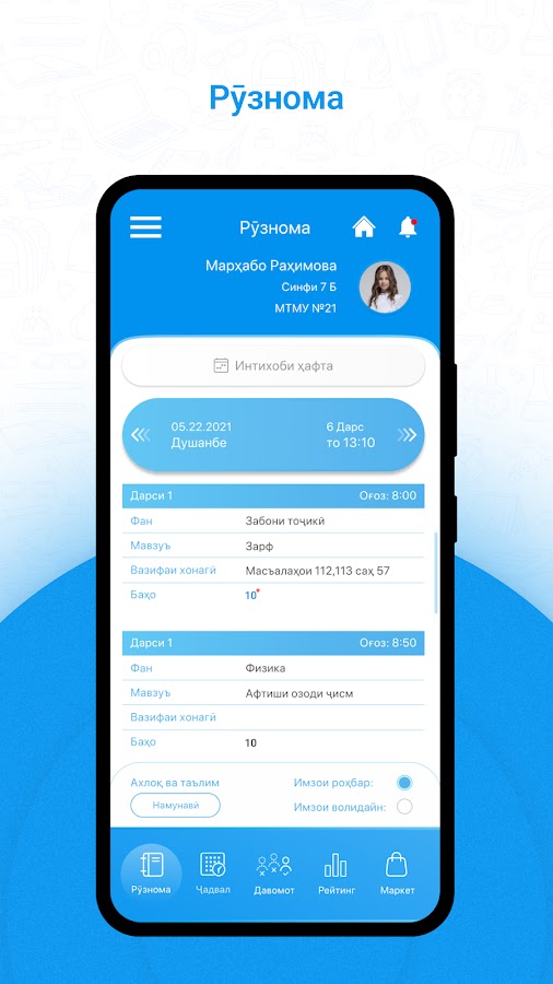 Ин барнома ҳамчунин шомили унсурҳои мухталифи иттилоотӣ, аз ҷумла журнал ва рӯзномаи электронӣ, ҷадвали дарсҳои асосӣ ва иловагӣ, назорати давомоти хонандагон ва мониторинги сатҳи дониши онҳо, мебошад. Тавассути ин барнома волидон метавонанд аз вазифаҳои хонаги фарзандонашон аз фанҳои таълимӣ, супоришҳои омӯзгорон ва дигар маълумоти зарурӣ, ки аз маъмурияти муассисаи таълимӣ мерасад, бо паёмак ба телефон дастрас намояд.