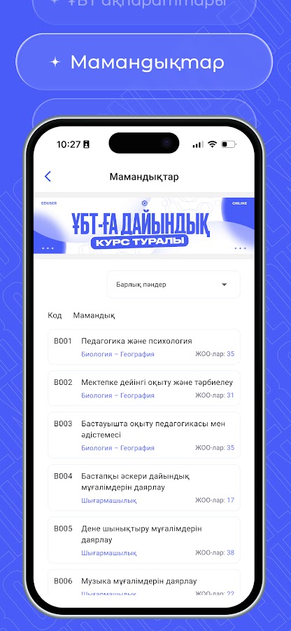 EDUSER – білімге арналған сервистер. Ұстаздарға, оқушыларға, студенттерге, ата-аналарға арналған кешенді сервистер. Мамандықтар мен олардың сипаттамалары, университеттер, профориентологиялық тесттер. Онлайн курстар мен тесттер. Гранттардың анализдері.