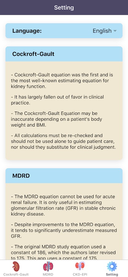 «Калькуляторы СКФ Pro: оценка функции почек» поможет медицинскому работнику рассчитать приблизительную скорость клубочковой фильтрации (СКФ) в повседневной практике. «Калькуляторы СКФ Pro: оценка функции почек» содержит три наиболее часто используемые формулы для расчета скорости клубочковой фильтрации (СКФ), а именно формулу Кокрофта-Голта, формулу модификации диеты при почечной недостаточности (MDRD) и формулу сотрудничества по эпидемиологии хронических заболеваний почек (CKD-EPI). Эти 3 формулы (Кокрофта-Голта, MDRD и CKD-EPI) широко используются для измерения функции почек.