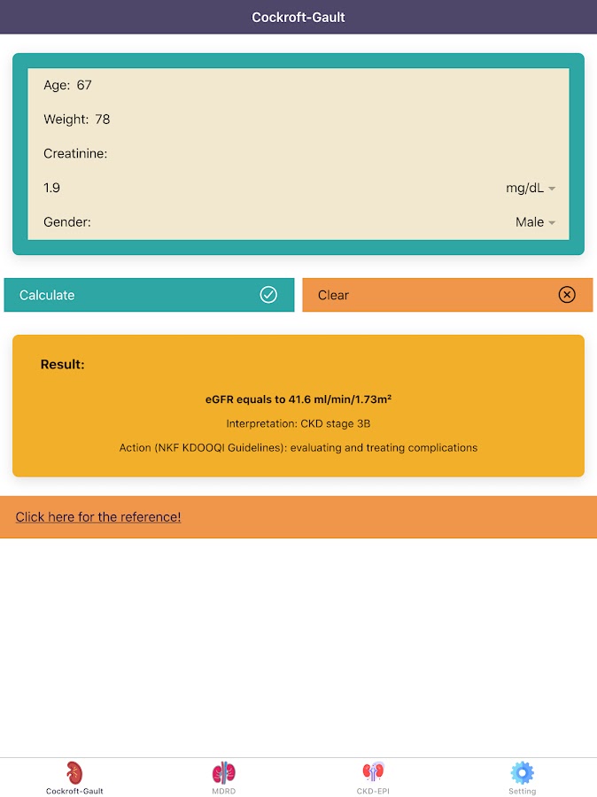 Заявление об ограничении ответственности: все расчеты должны быть перепроверены и не должны использоваться отдельно для руководства по уходу за пациентом и не должны заменять клиническую оценку. Расчеты в этом приложении «Калькуляторы СКФ Pro: оценка функции почек» могут отличаться от вашей практики. При необходимости проконсультируйтесь с опытным врачом.