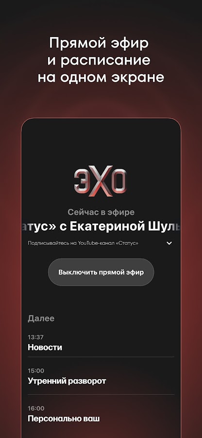 «Эхо» — независимый источник информации на русском языке для вашего устройства на платформе Android. Наше приложение — безопасный и удобный способ оставаться на связи и получать качественную информацию.