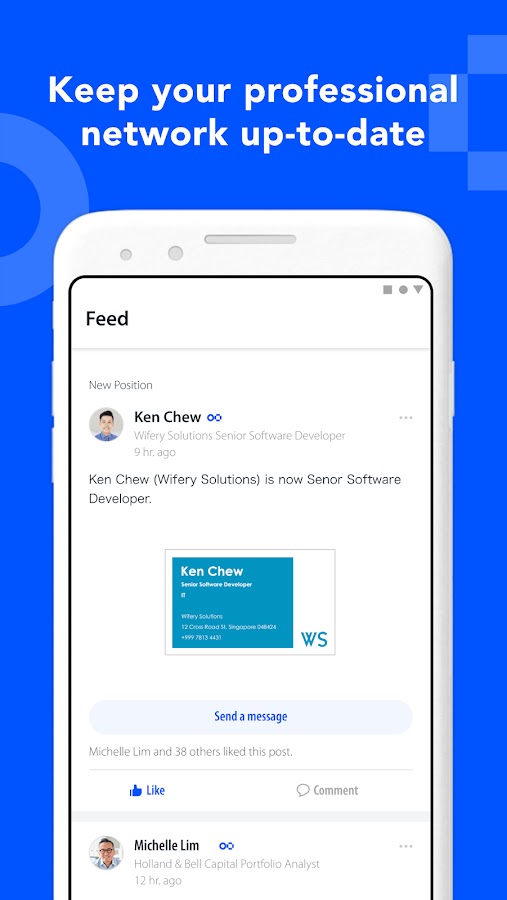 When you connect with someone via Eight, you’ll be notified when they change their biz card because of a career move such as a promotion or job change. You can also message your contacts via Eight and build your relationships, , keeping scanned information current.