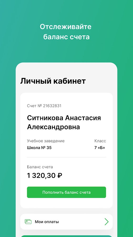 · Видеть и контролировать балансы лицевых счетов ваших детей