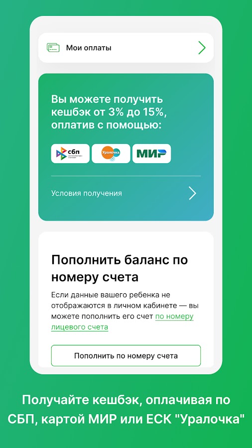 Кешбэк 5% за пополнение счета школьного питания (Екатеринбург, Каменск-Уральский, Лесной) и по услугам детских садов (Екатеринбург) через СБП. Акция действует с 01.09.2025 до 31.12.2025. Подробные условия акции доступны по ссылке внутри приложения.