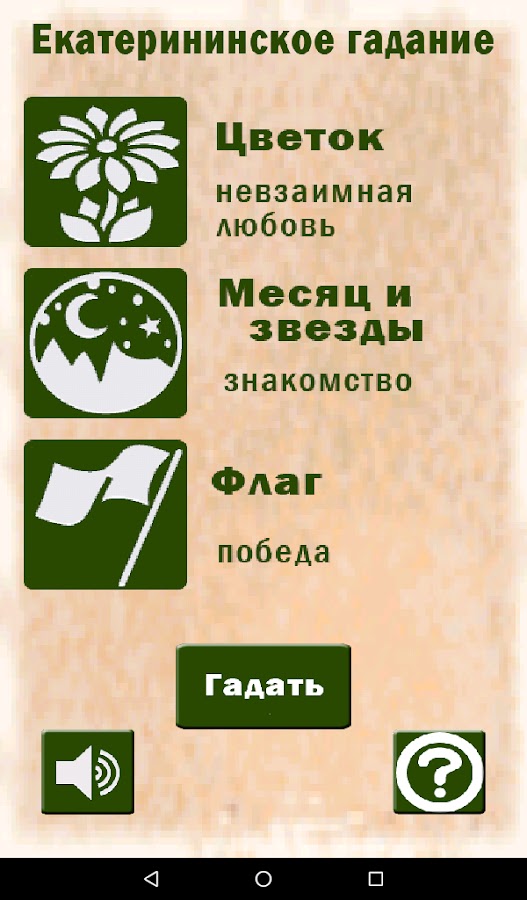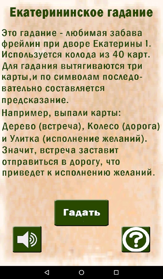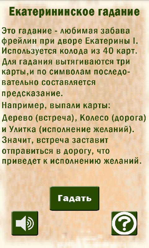 Скачайте приложение Екатерининское гадание для Android бесплатно - последняя версия (1.0) уже доступна для установки на ваш телефон или планшет.
