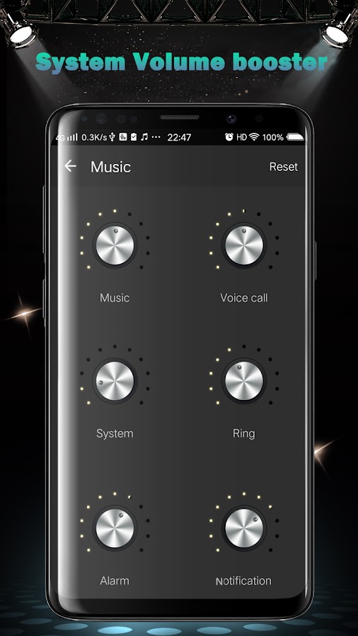 Эквалайзер, усилитель низких частот и усилитель громкости (Eq & Bass) также могут увеличить громкость системы мобильного телефона, например громкость мультимедиа, голоса, системы, мелодии звонка, будильника и подсказки, которыми вы можете легко управлять.
