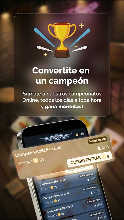 Бросьте вызов друзьям, поднимитесь в рейтинге и станьте чемпионом этой типичной аргентинской карточной игры.