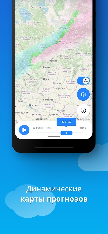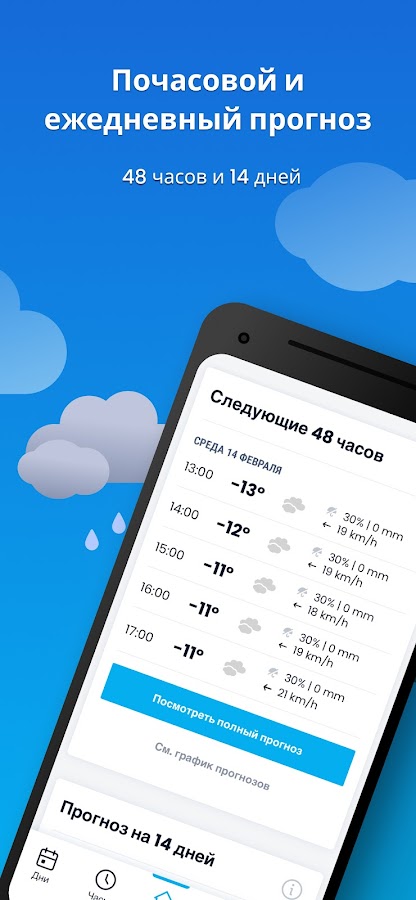 Вы получите подробные данные, такие как: температура, ощущаемая температура, вероятность осадков, ветер, УФ-индекс, влажность, вероятность грозы и радар дождя в реальном времени, а также уведомления об изменениях и развитии погодных условий.