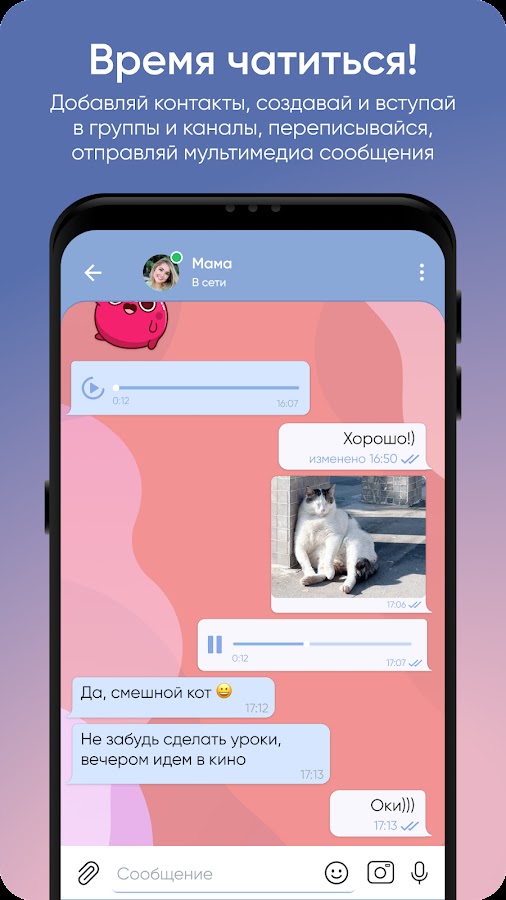 ⁃ общаться с родственниками и друзьями, которые используют KidGram или Telegram, в том числе в группах;