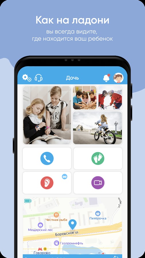 • Приглашать родных и близких отслеживать местоположение ребенка и обмениваться звуковыми сообщениями