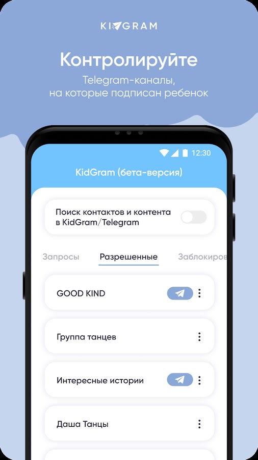 Установив KidGram на детский смартфон/планшет или активировав его в часах ELARI, вы сможете переслать детям интересный контент прямо из своего Telegram-аккаунта (а мы вам поможем найти контент). В KidGram дети получают доступ к общению и Telegram-каналам, при этом: