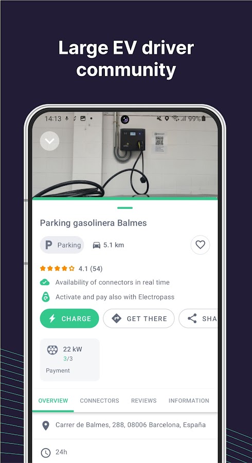 Electromaps имеет активное сообщество, насчитывающее более 200 000 зарегистрированных пользователей. Просмотрите фотографии и комментарии других пользователей, чтобы узнать репутацию зарядной станции или узнать, как ее легче найти. Добавьте свои комментарии или изображения и присоединяйтесь к нашему сообществу. Вы также можете добавить зарядные станции, которых нет в нашем приложении, чтобы ими могли пользоваться другие пользователи.