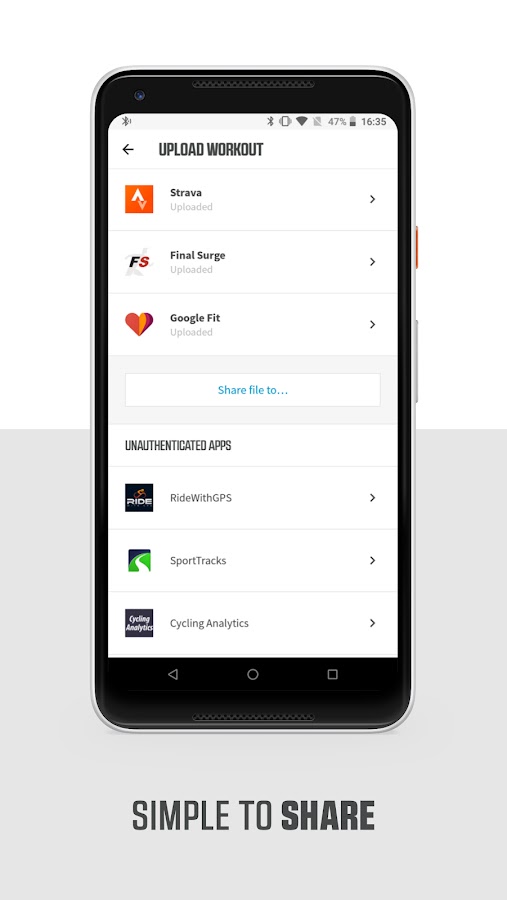Загрузить тренировки на ваших любимых веб-сайтов, в том числе учебных TrainingPeaks, Страва, RidewithGPS, Komoot, HealthKit и многое другое