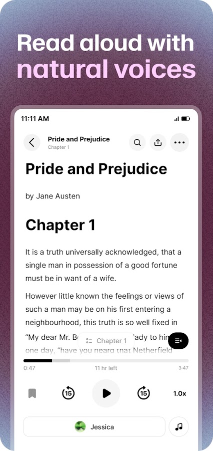 ElevenReader предоставляет вам больше возможностей для прослушивания за меньшие деньги. Никаких запутанных кредитов. Никаких завышенных цен на подписки. Просто тысячи премиальных аудиокниг и электронных книг по низким ценам, плюс контент, который вы приносите с собой.