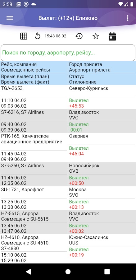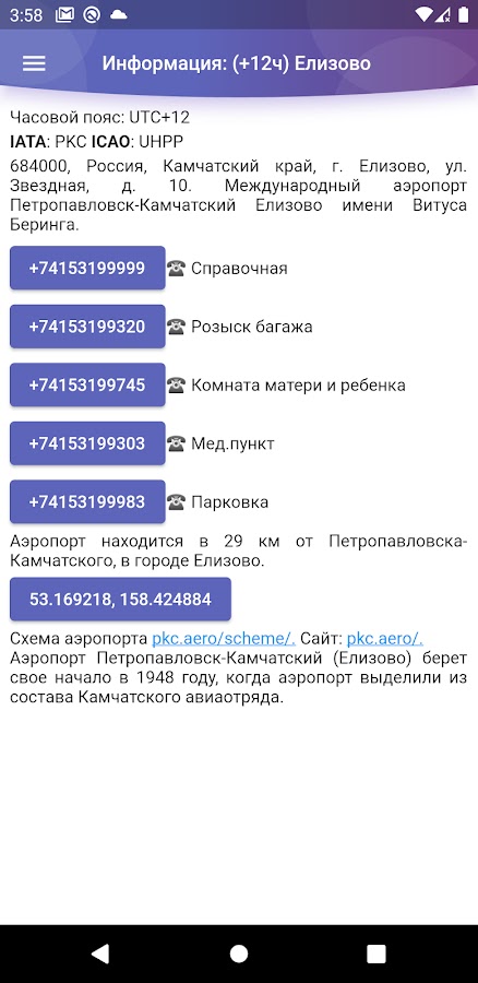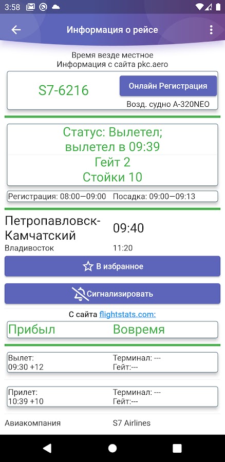 Неофициальное приложение с информацией о статусах вылетов и прилетов самолетов в аэропорту Елизово (Петропавловск-Камчатский). Дополнительно расписание рейсов и прочая полезная информация.