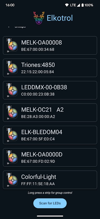 Elkotrol — ваш незаменимый помощник для легкого управления светодиодными лентами «ELK-BLEDOM» и «ELK-BLEDOB». Хотите ли вы создать идеальную атмосферу, запланировать световые режимы или синхронизировать свет с музыкой, Elkotrol поможет вам.
