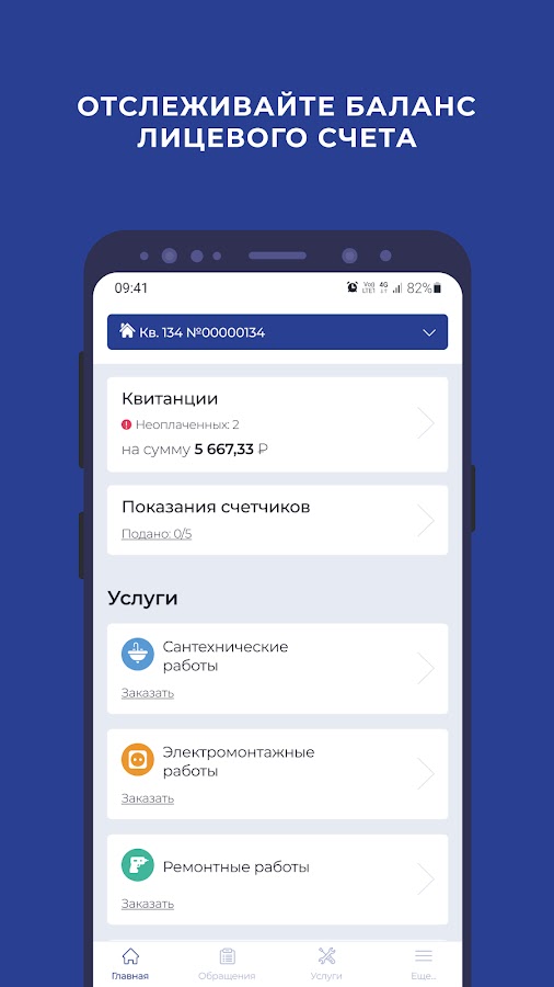 • Отслеживать баланс и другую информацию по всем лицевым счетам помещений: квартир, коммерческих помещений, апартаментов, парковочных мест, частных домов и т. д.