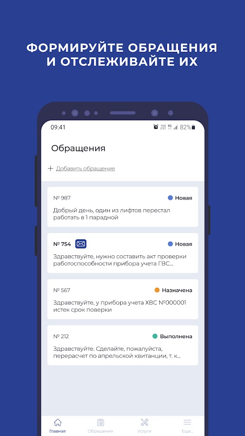 • Формировать обращения в управляющую компанию, прикреплять файлы, отслеживать статус исполнения обращений