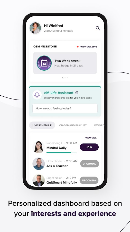 Добро пожаловать в eM Life на Android! eMindful помогает отдельным людям и командам стать более устойчивыми благодаря онлайн-классам, которые способствуют улучшению здоровья. Мы уже продемонстрировали десяткам тысяч участников по всему миру практические навыки, которые ведут к более здоровой, продуктивной и целеустремленной жизни. Когда вы будете практиковаться в нашем растущем сообществе, вы будете общаться с командой опытных преподавателей, которые могут дать проверенные, эффективные результаты.