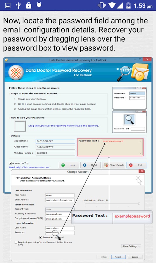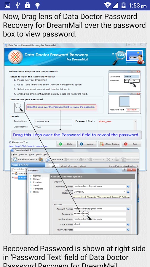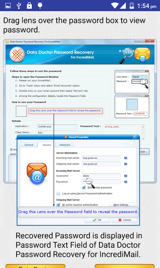 Приложение советует пароль разоблачать и Reveal шаги, чтобы преобразовать пароль, скрытый за звездочками или точками с использованием соответствующих данных Доктор Password Recovery программного обеспечения для Windows. Данные доктор Password Recovery Software выявляет сохраненные пароли от всех типов электронных писем, настроенных во всех видах сообщений электронной почты всех типов веб-сайтов, а также популярных почтовых сервисов, таких как Gmail Hotmail прогноз Yahoo AOL и т.д., независимо, настроенные SMTP POP3 или IMAP на основе настроек над SSL TSL или стандартные параметры проверки подлинности.