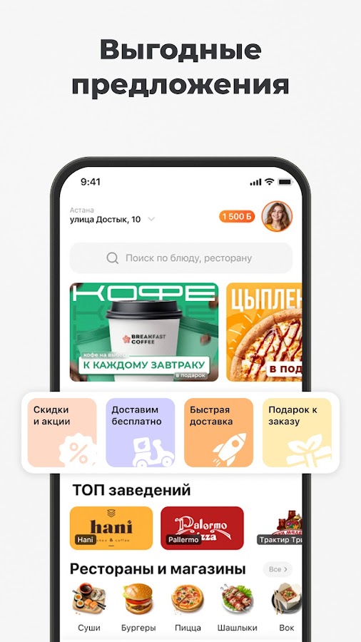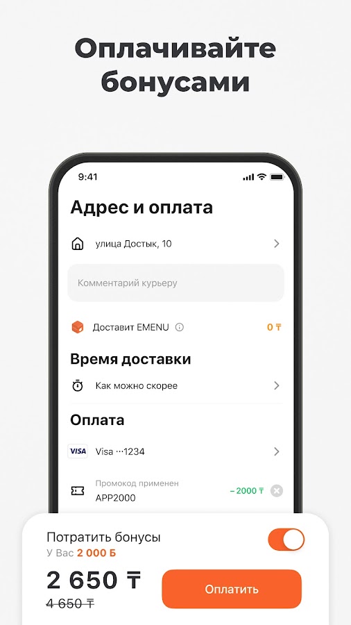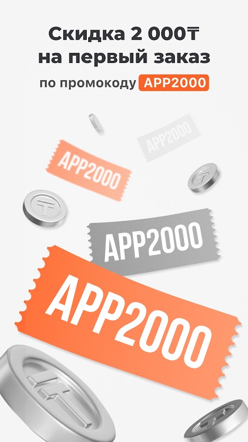 Первые 4 доставки дарим бесплатно, а приятный бонус — промокод APP2000 на скидку в 2000₸.