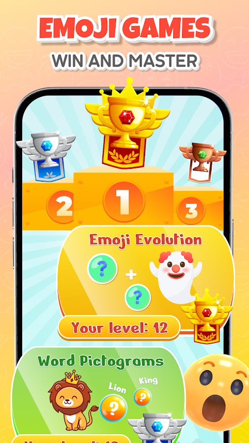 🪁 Пиктограммы слов: Точно так же, вы должны правильно угадать emoji из данного слова, чтобы перейти на следующий этап. Сложность в играх эмоджи микс будет постепенно увеличиваться.