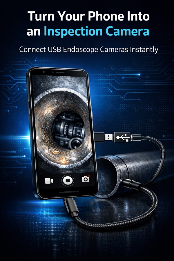 Endoscope Camera Connector — это приложение, которое подключает ваш телефон к эндоскопической камере или любому устройству, такому как USB-камера или бороскоп, включая камеры для инспекции канализации. Существует множество устройств, использующих внешние камеры, например, инспекционные камеры для канализации.