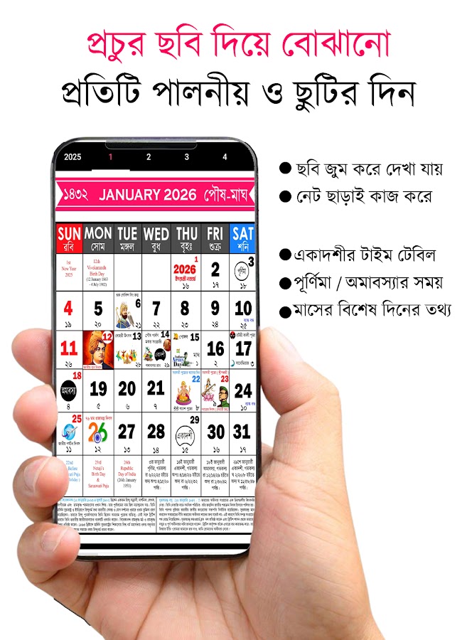 Этот бенгальский календарь 2026 года обладает всеми функциями настенного календаря. Получайте уведомления обо всех благоприятных датах бракосочетания, пуджах, Иде, Наваратри, Дурга-пудже и всех необходимых праздничных датах на одной странице.