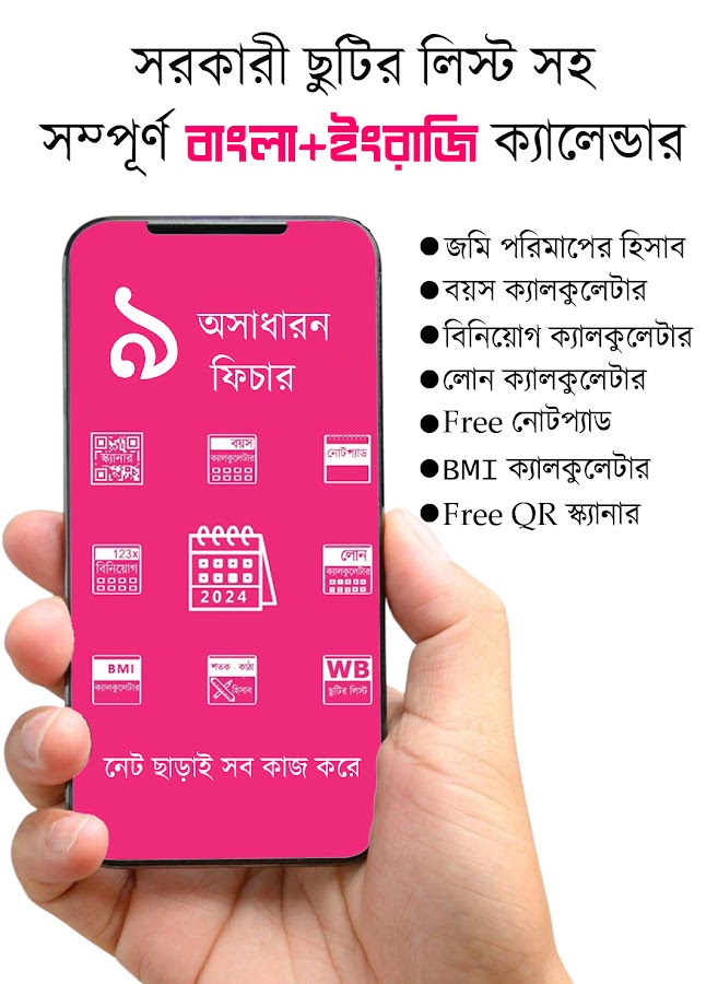Это приложение отображает даты по месяцам на бенгальском и английском языках. Вы можете добавлять заметки. Вы можете использовать встроенный QR-сканер для сканирования QR-кодов. Вы можете использовать встроенный финансовый калькулятор для расчета FD и SIP для паевых инвестиционных фондов. Это приложение предоставляет полную информацию о праздниках в Западной Бенгалии. Вы найдете информацию о государственных праздниках и всех саркари-чутти (праздничных днях в офисах).