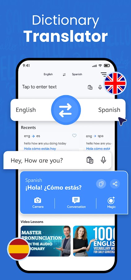 English Dictionary Translator — бесплатное словарное приложение для языкового и голосового перевода. Это не просто бесплатное офлайн-словарное приложение, в котором вы можете переводить только слова на другие языки. С помощью этого простого приложения-словаря и тезауруса вы сможете переводить слова, фразы, предложения и разговоры на родные языки, чтобы получить точный родной язык. перевод. Наше лучшее бесплатное приложение-словарь английского языка имеет множество функций, таких как быстрый словарь, голосовые переводы, перевод в реальном времени, сохранение переводов, сканированный перевод, переводы разговорников и перевод с экрана. Вы также можете получить синонимы и антонимы, а также прослушать аудиофайлы с произношением и примеры предложений.