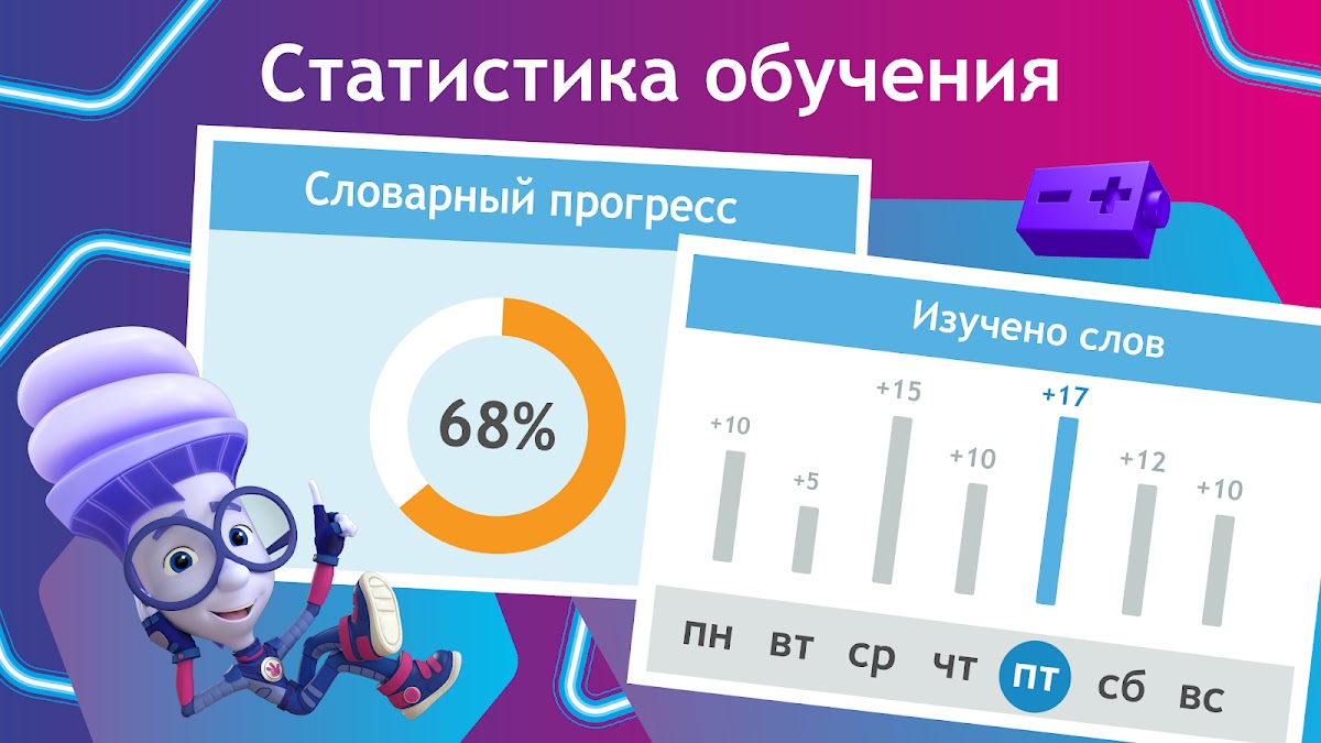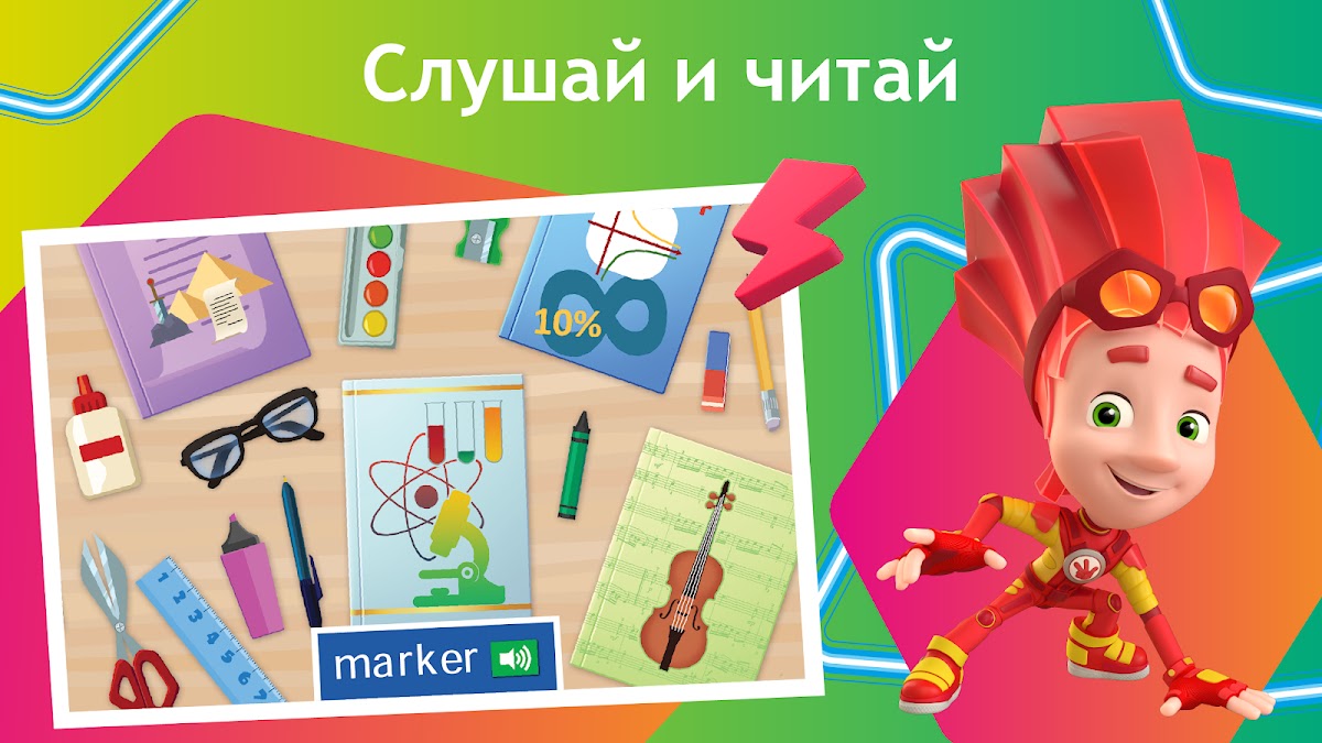 Учим английские слова вместе с Фиксиками. Развивающее приложение разработано специально для детей в возрасте от пяти лет и старше, насыщено анимацией и красочной графикой, полностью озвучены персонажи и задания, а интерфейс прост и понятен ребёнку.