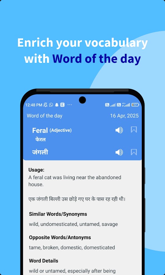 Освойте английский и хинди с помощью приложения-словаря и тренажера английского языка HinKhoj — вашего универсального решения для перевода, расширения словарного запаса и практики разговорной речи с помощью ИИ. Благодаря обширной базе данных, содержащей более 500 000 слов, мы предоставляем определения, синонимы, антонимы и примеры использования в реальной жизни, чтобы вы не просто выучили слово, а освоили его в совершенстве.