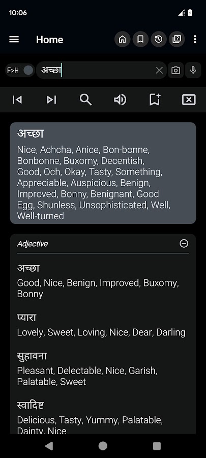 • Двусторонний поиск: плавное переключение между переводами с хинди на английский и с английского на хинди.