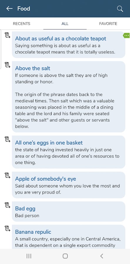 Это полезно приложение для Вы можете узнать идиомы, фразы и поговорки на английском языке очень легко и эффективно. Он имеет более чем 10000 идиомы и фразы, это поможет вам легко и эффективно искать