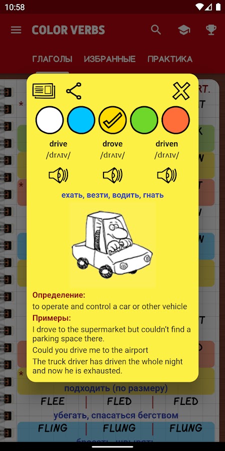 Приложение «Color Verbs» предоставляет список из 200 наиболее употребляемых неправильных глаголов английского языка. Каждый глагол содержит определение на английском языке, примеры использования в предложениях, иллюстрацию, аудио произношение и фонетическую транскрипцию. Есть возможность выделять неправильные глаголы различными цветами (красный, желтый, зеленый, голубой), что значительно улучшает удобство работы и восприятие информации в дальнейшем. Также программа «Color Verbs» дает возможность скрывать различные столбцы и закреплять свои знания в викторине.