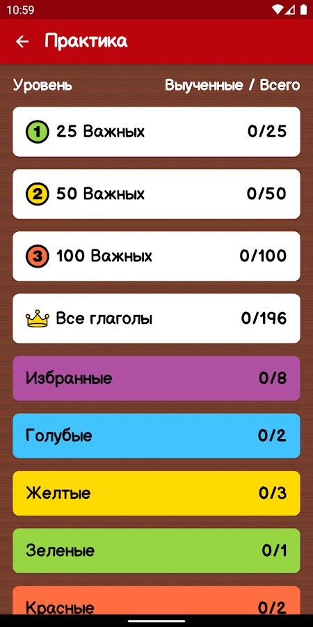 Ты знаешь все формы английских неправильных глаголов? “ColorVerbs” поможет тебе выучить или освежить в памяти твои знания всех форм неправильных глаголов. Наиболее удобный способ запоминания неправильных глаголов – это регулярный набор на клавиатуре всех его форм в связке с примерами из текста и прослушиванием произношения носителей языка. В режиме “Практика” от тебя потребуется собрать из предоставленных букв правильные формы для соответствующих неправильных глаголов. Если ты допустишь ошибку – ты будешь должен ввести корректную форму неправильного глагола снова.