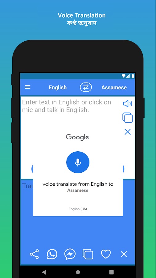 А) Нажмите кнопку «Микрофон» и произнесите текст. Как только вы закончите голосовой ввод, нажмите «Перевести», и приложение «Английский на ассамский переводчик» переведет текст.