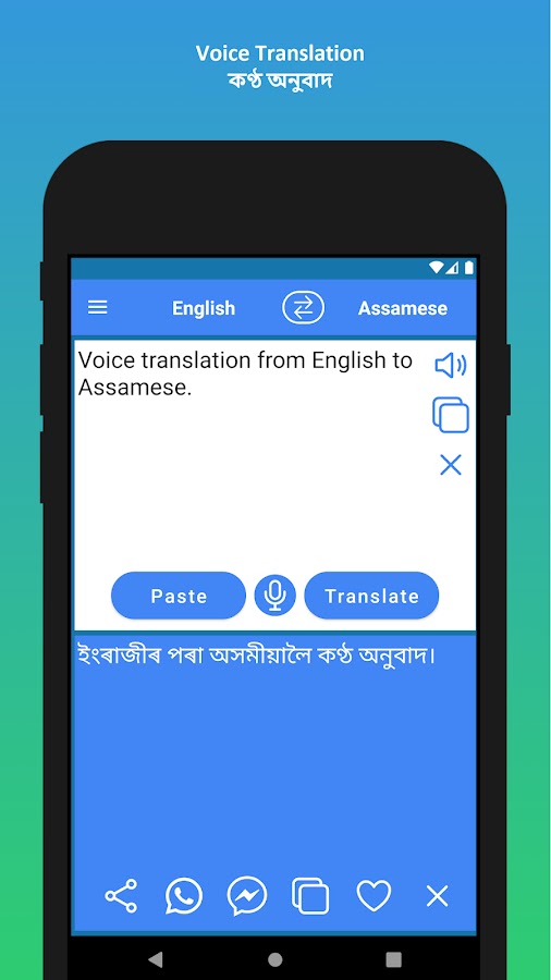 ✓ Используя встроенную технологию распознавания голоса, вы можете вводить текст голосом, а затем переводить его. Эта удобная функция позволяет переводить обычные разговоры. Вы можете перевести свой английский голос на ассамский и ассамский голос на английский.