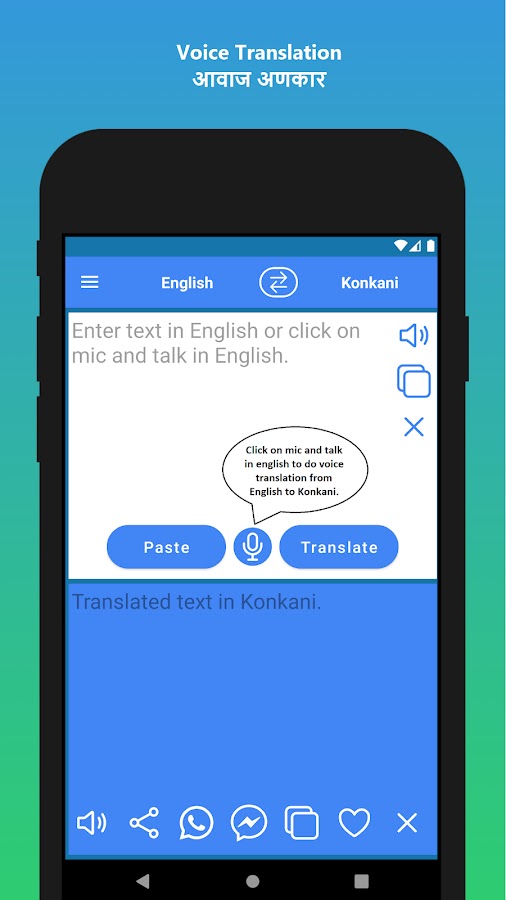 ✓ Используя встроенную технологию распознавания голоса, вы можете вводить текст голосом, а затем переводить его. Эта удобная функция позволяет переводить обычные разговоры. Вы можете перевести свой английский голос на конкани и голос конкани на английский.