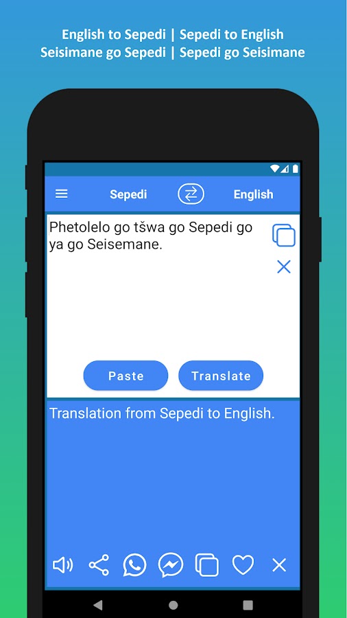 ✓ Используйте его как словарь. Вы можете ввести слова на английском языке и получить точное слово на сепеди. Вы можете ввести слова на сепеди и получить точное слово на английском языке.